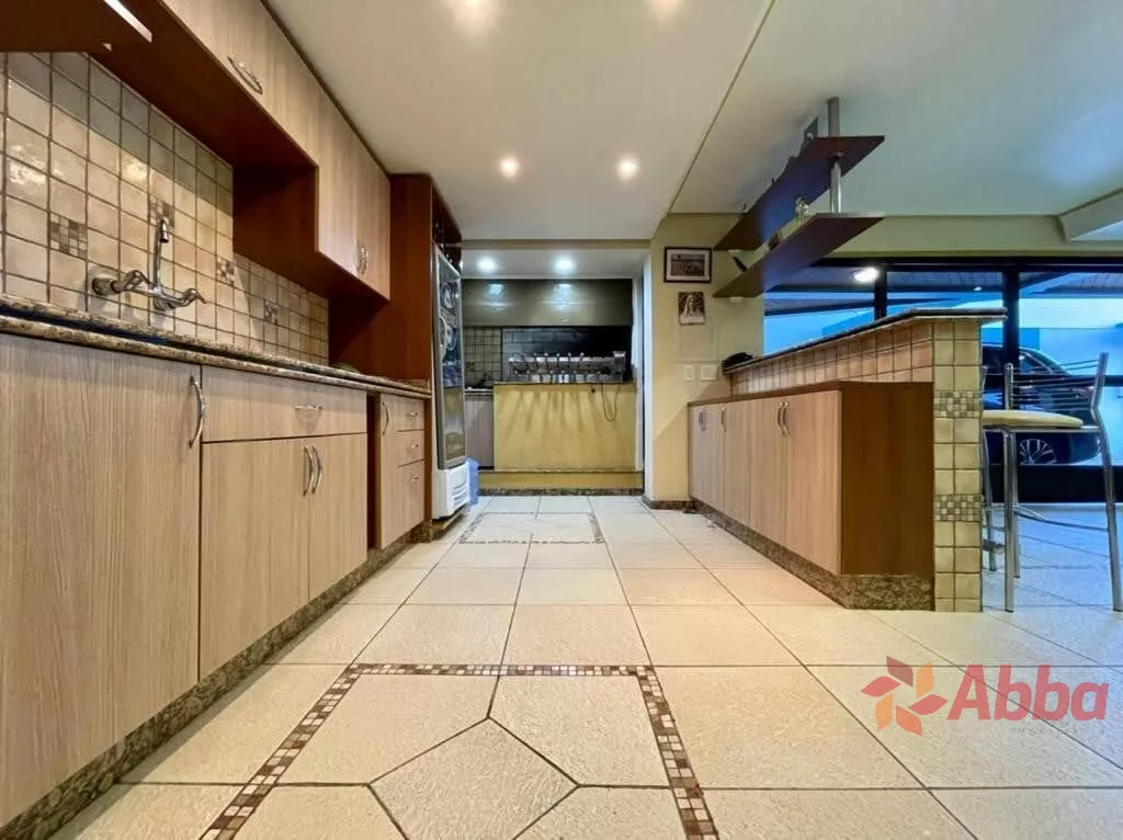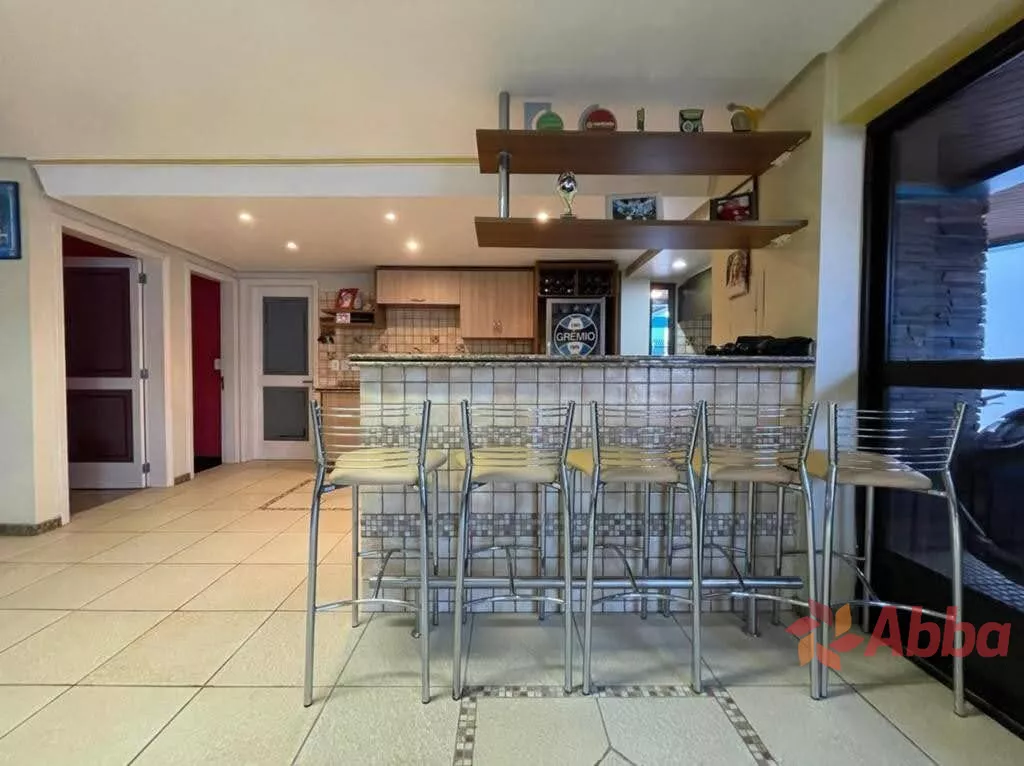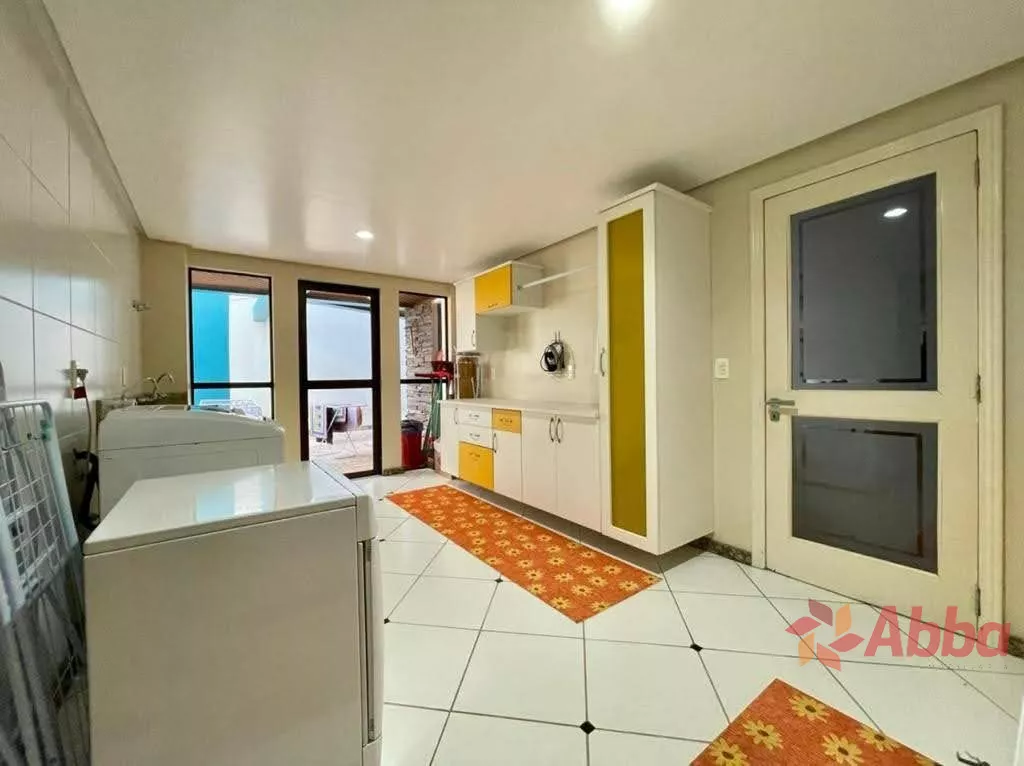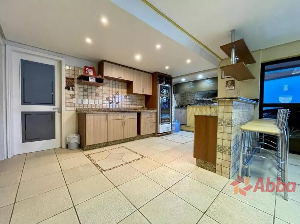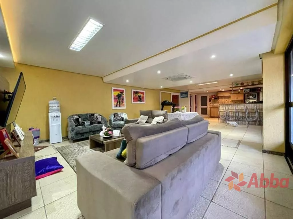 O espaçoso living é dividido em três ambientes, um deles com lareira, e todos apresentam acabamento em gesso e sancas, proporcionando um toque de sofisticação. A cozinha é ampla, a lavanderia é separada e há uma área gourmet equipada com churrasqueira, ideal para receber amigos e familiares.
