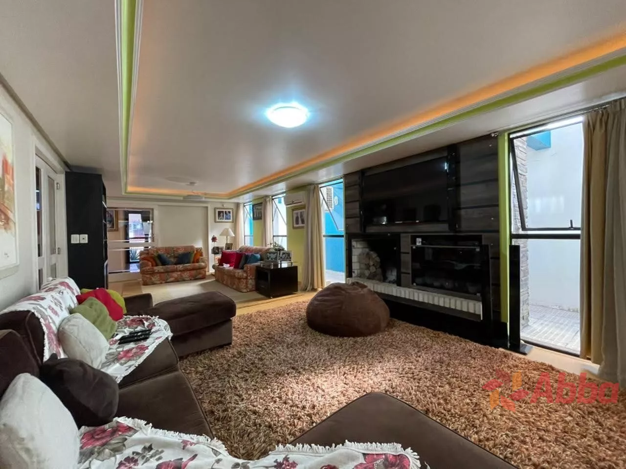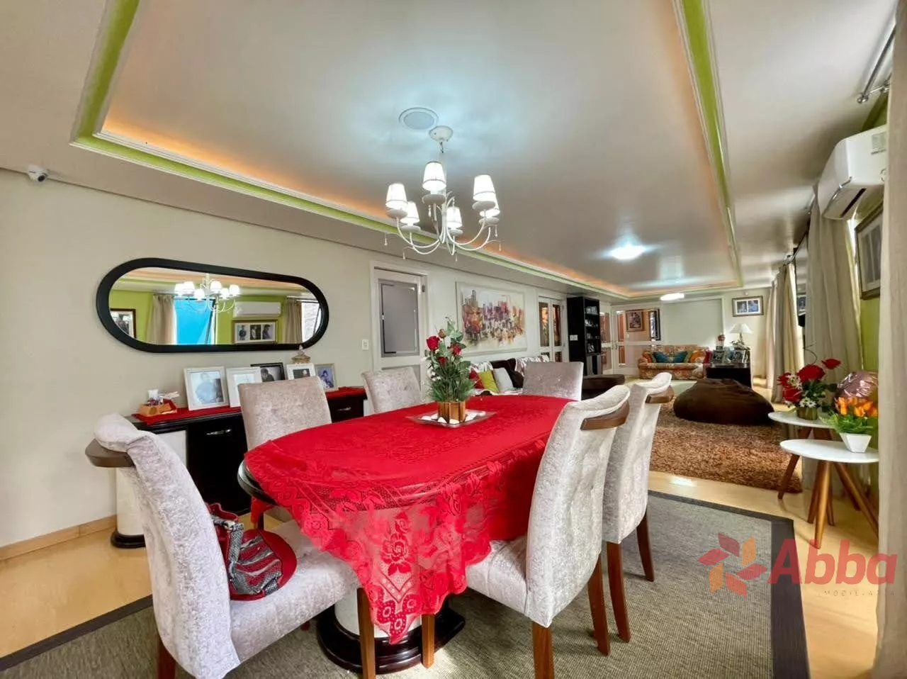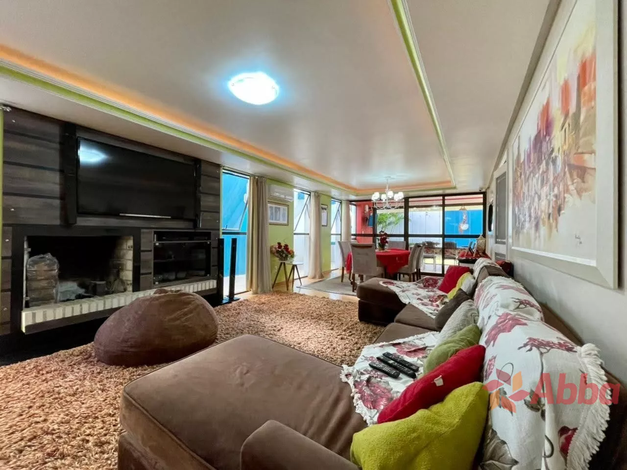 O espaçoso living é dividido em três ambientes, um deles com lareira, e todos apresentam acabamento em gesso e sancas, proporcionando um toque de sofisticação. A cozinha é ampla, a lavanderia é separada e há uma área gourmet equipada com churrasqueira, ideal para receber amigos e familiares.
