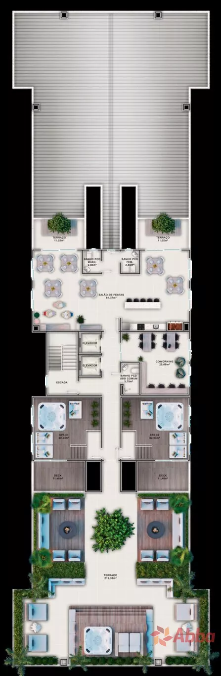 Área de laser com: rooftop com 3 spas, salão de festas, fire place, solarium e coworking em cada torre, além de espaço pet, espaço kids, vaga com carregamento elétrico no térreo e placas energia solar para área de uso comum.