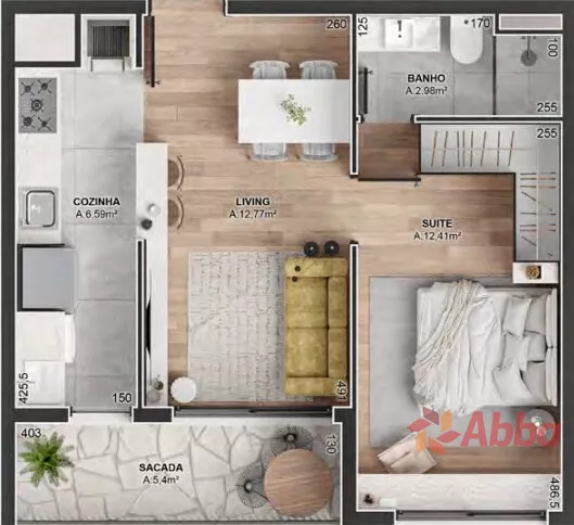 Apartamento de 1 dormitório com suíte, sala, sacada, cozinha e garagem.