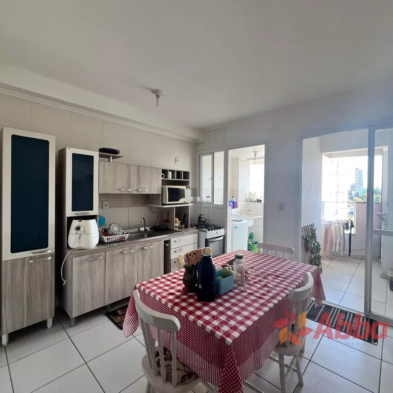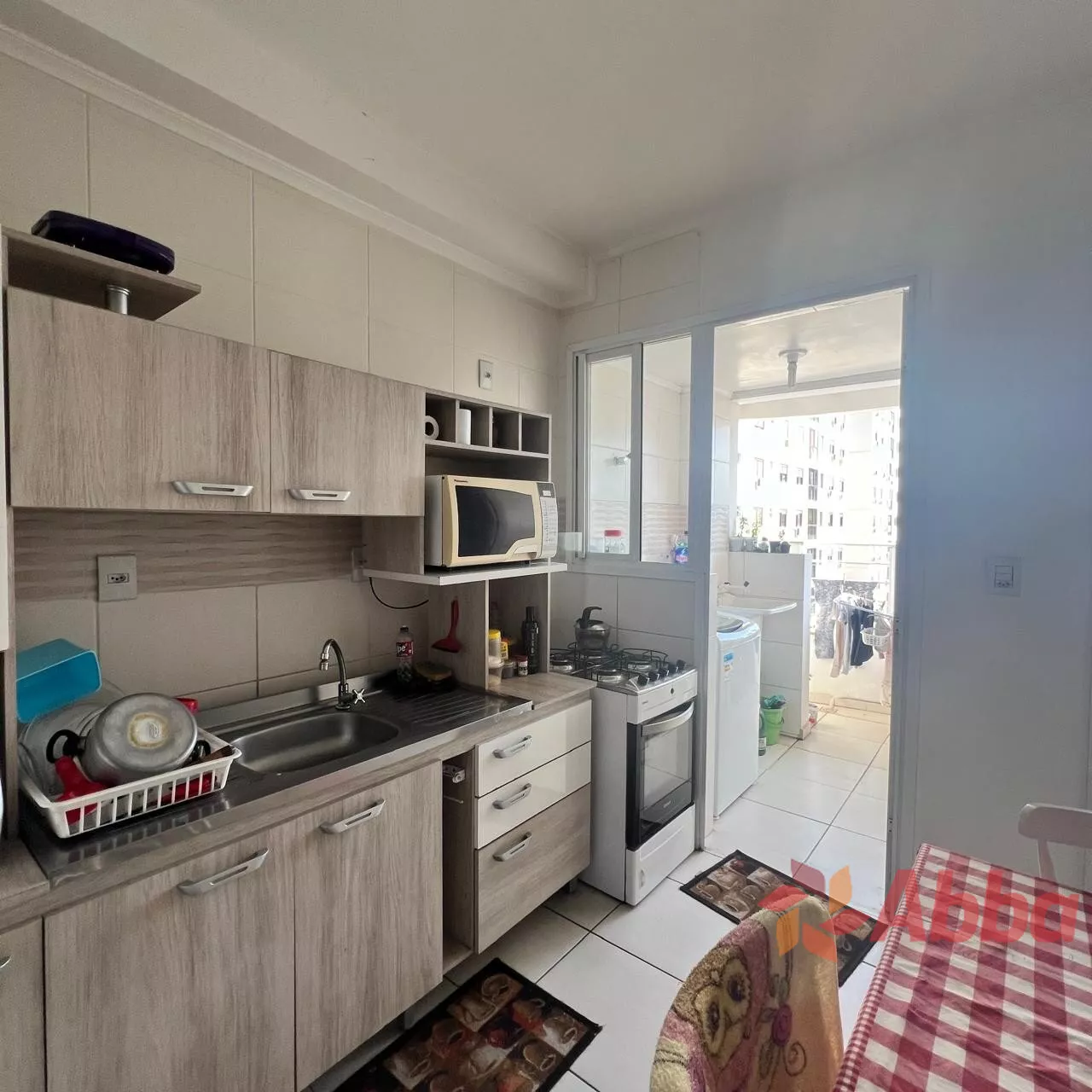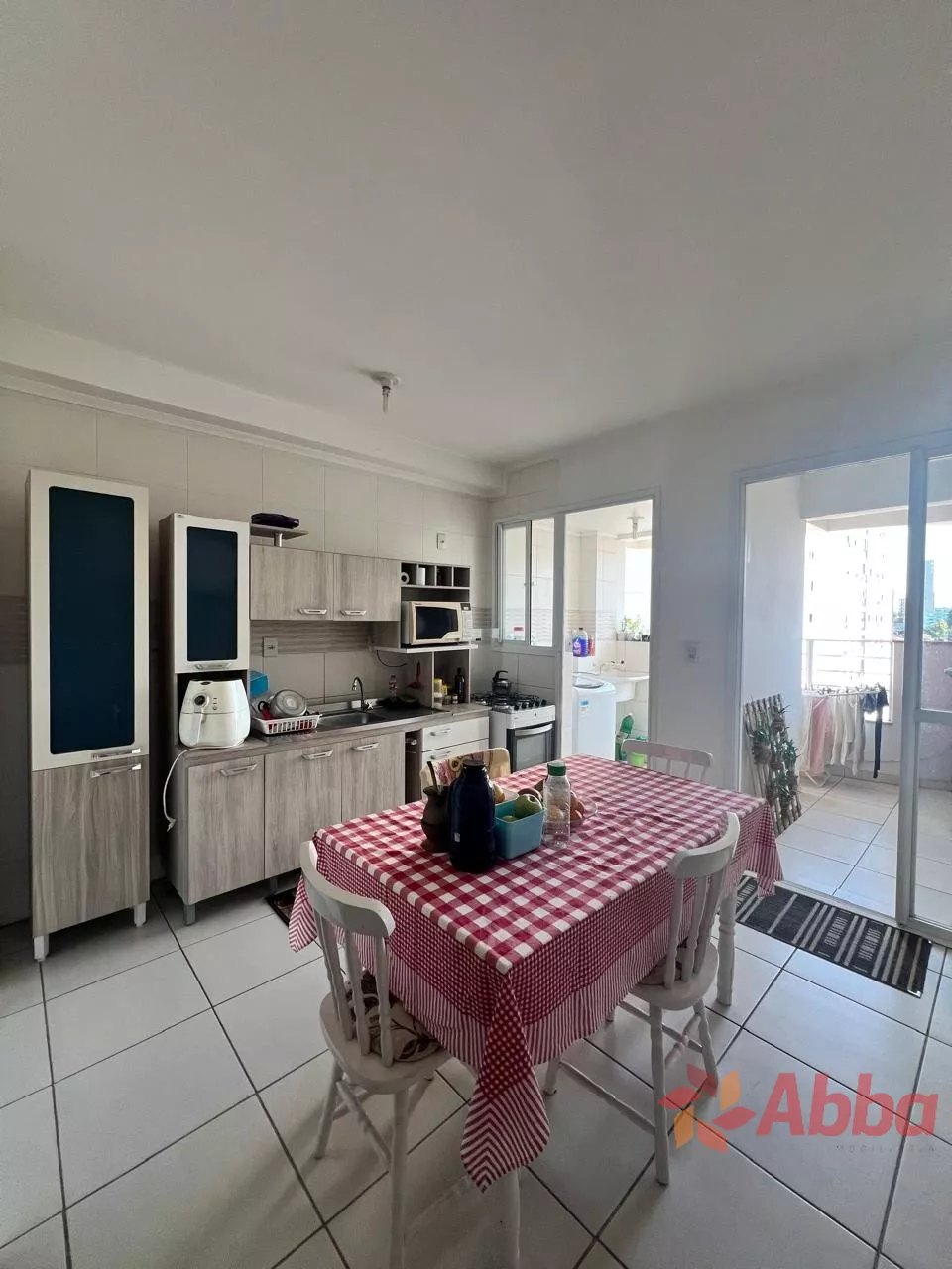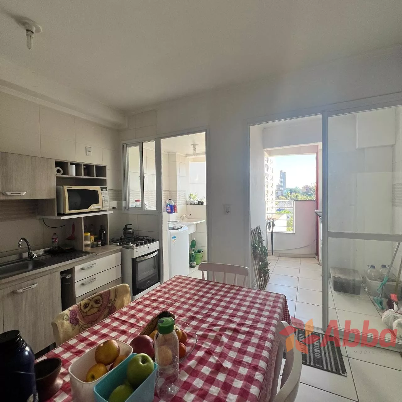 2 dormitórios sendo 1 suíte, cozinha e área de serviço, sala com sacada e churrasqueira, banheiro social e vaga de garagem.